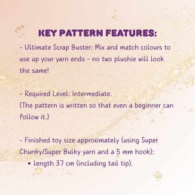 - Finished toy size approximately (using Super Chunky/Super Bulky yarn and a 5 mm hook) - length 37 cm (including tail tip).