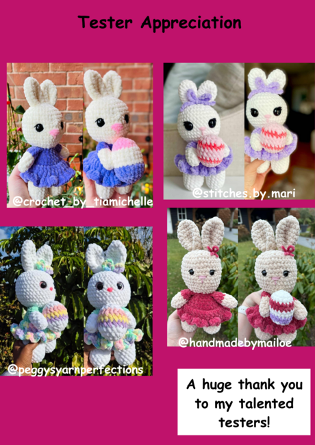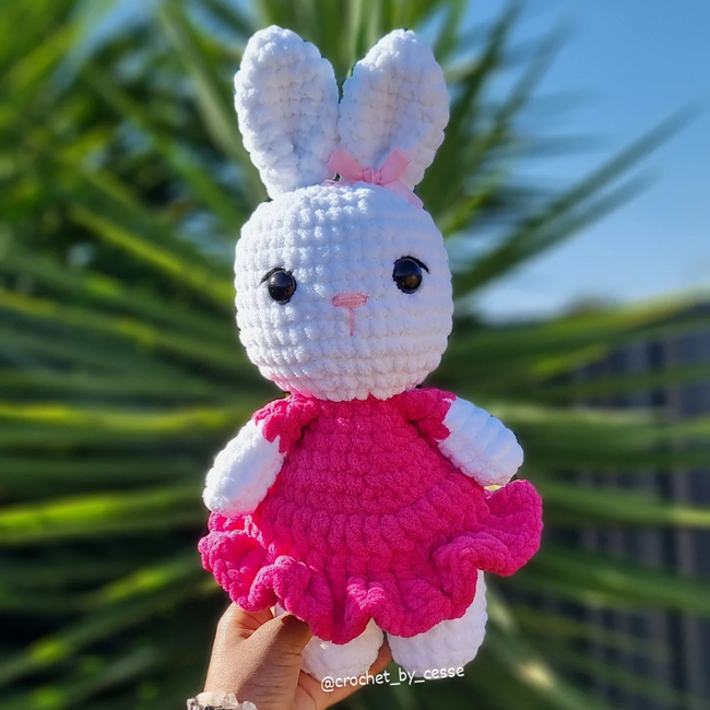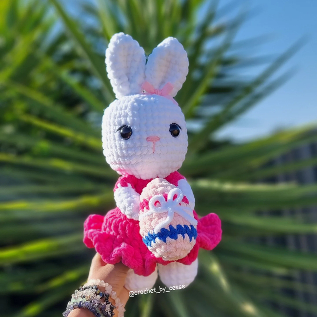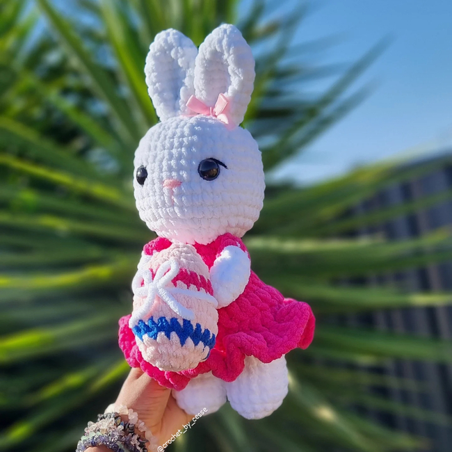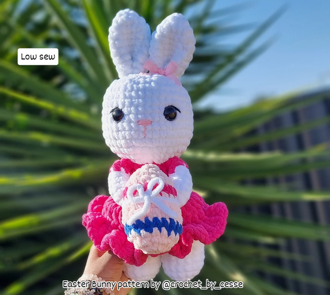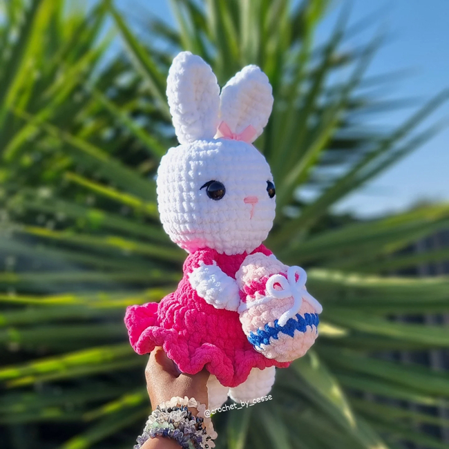 This is a beginner-friendly pattern showing you how to make your own Easter Bunny in a dress holding an egg! This bunny is low sew (only sew her ears) and works up so quickly!
