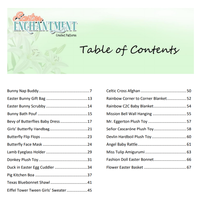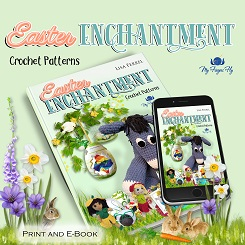 Enter the enchanting world of bunnies, butterflies, and barnyard animals in crochet. This collection of over 20 crochet patterns will delight the entire family this Easter - from a large donkey plush toy made with blanket yarn for the littles to a Texas bluebonnet shawl for Mom. Make a few bunny treat bags and fill them with candy, hook an Easter basket for the flower child in your family, or crochet Baby a colorful butterfly dress for Easter.