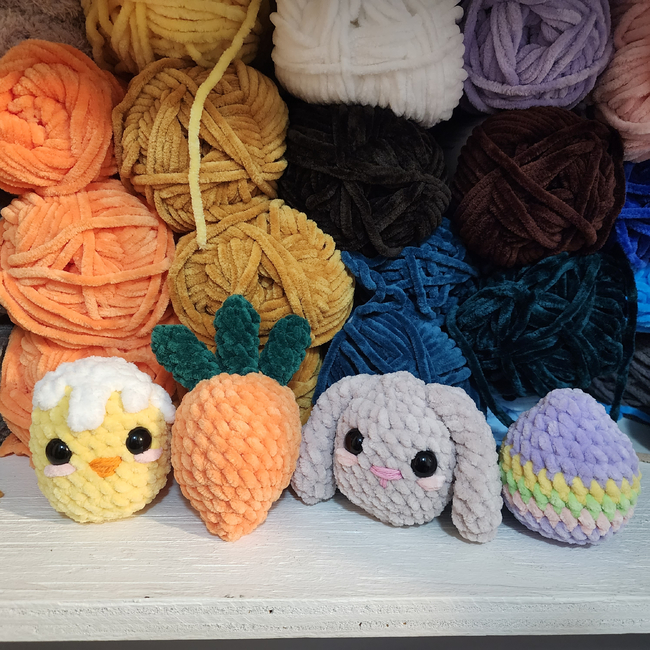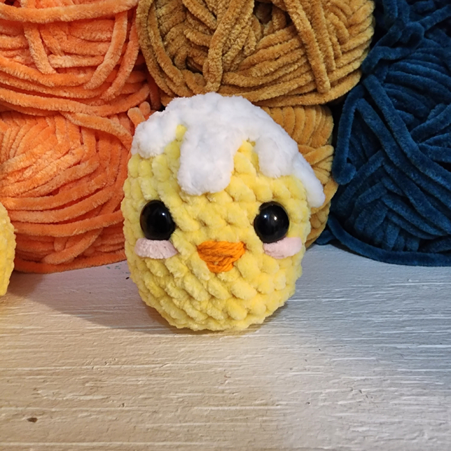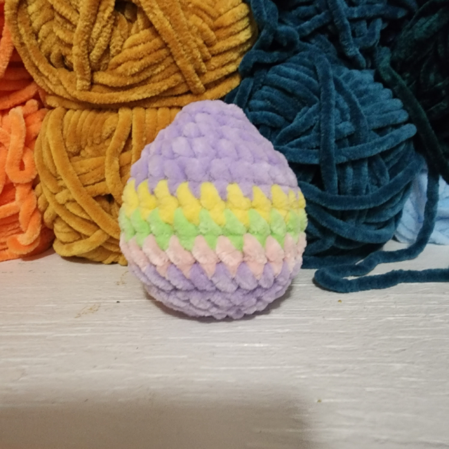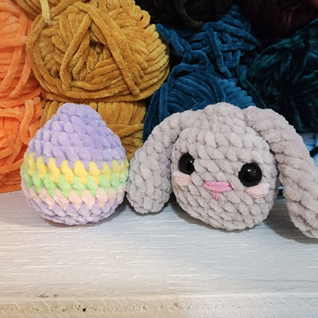 This pattern is beginner friendly, worked in the round, and requires minimal sewing. Prior knowledge of color changes is necessary for creating the Easter Egg.