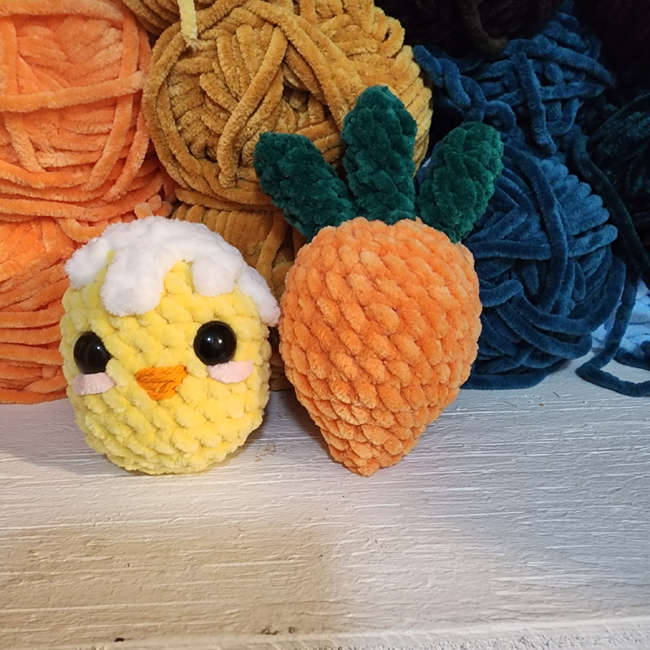 The Easter Minis pattern is a 4-in-1 pattern designed by Sierra Salazar AKA Sara Beara Crochet. Inside is the step by step instructions for making a baby chick with an eggshell hat, an Easter Egg, a Bunny, and a Carrot.