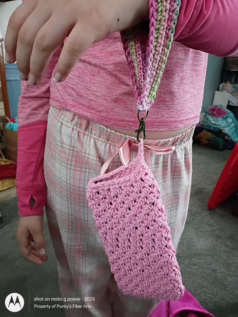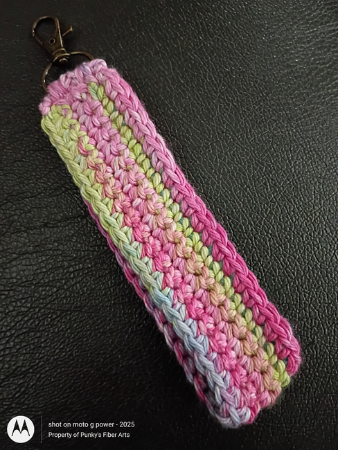 Punky's Patterns Co with Punky's Fiber Arts-Patricia designed the Easy Crochet Wristlet Keychain Strap with Textured Phone Case pattern. Find more of their patterns on their Ribblr shop page.