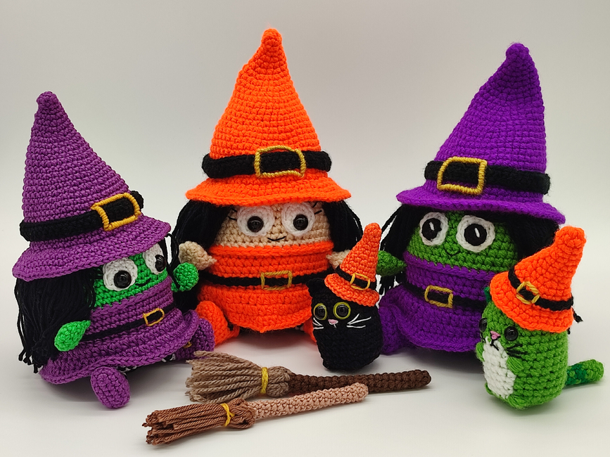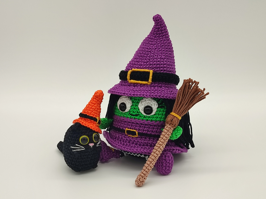 Introducing the enchanting Eggy Witch Crochet Pattern! This delightful design features Eggy Witch in a whimsical purple dress and matching hat, complete with stylish boots and intricate buckles. Her green skin and flowing black hair add a magical flair, and she even comes with a broomstick. Plus, as a special bonus, the pattern includes the Mini Eggy Kitten pattern and an exclusive kitten hat, allowing you to craft her adorable black cat companion. Perfect for Halloween decorations or as a charming handmade gift, this pattern is ideal for crafters of all skill levels. Let the magic of crochet bring Eggy Witch and her kitten to life!