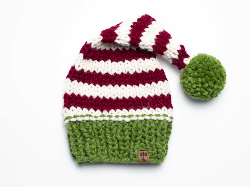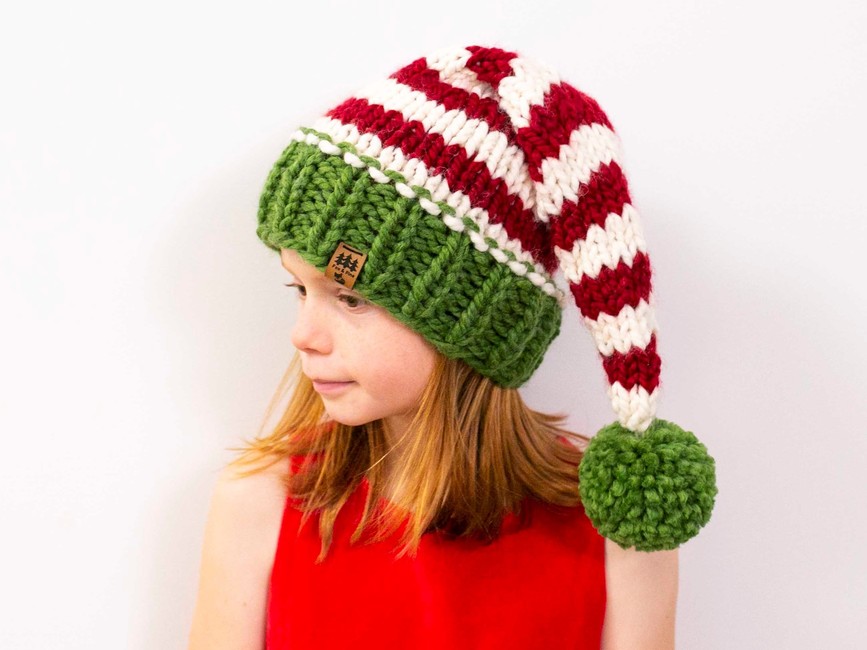 Our chunky Christmas elf stocking cap hat knitting pattern makes the perfect family Christmas photography prop or winter hat for your little one. This pattern is a twist on our original Santa cap. Changes are - slower, more gradual decrease as you work the top of the hat; slightly different style when transitioning from the brim to the main section of the hat; more sizes included.