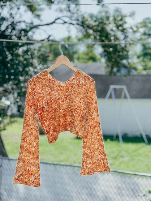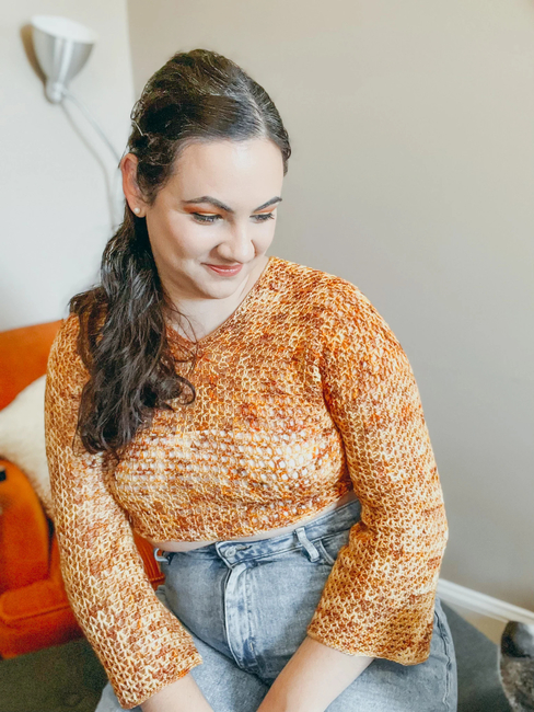 The ember v neck is a fun and eclectic pattern that uses fingering weight yarn. It's worked from side to side, and the body panel is made all in one piece, with sleeves crocheted on at the end. The greatest part? It requires NO SEAMING! The sleeves have a fun flair on the end as well.