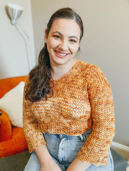 YarnThrift designed the Ember V Neck pattern. Find more of their patterns on their Ribblr shop page.