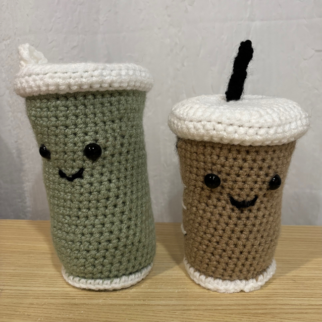 With this beginner friendly pattern you can make your own emotional support coffee! Change the main color to create different beverages, add layers to add cold foam, or even change the lid style. Customize this with writing your name on the side or changing the amount of rounds to change the size of the drink. Enjoy!