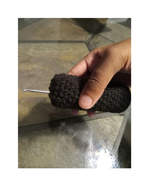 To make Ergonomic Crochet Hook Pattern you will need: Supplies: You will need 2 crochet hooks any size. I used a 3mm crochet hook to crochet most of the piece and I used a 5mm crochet hook to finish the piece. You will need painters tape. I used painters tape but any tape will work as well. You will need paper towel. I used 4 sheets of paper towel but kept the pieces of paper towel connected like in the picture. You will need acrylic yarn. I used weight 4 medium size acrylic yarn and you will need a stitch marker of any kind and a yarn needle to weave in the ends.This pattern will work for most crochet hooks. I made the handle for a 3mm crochet hook..