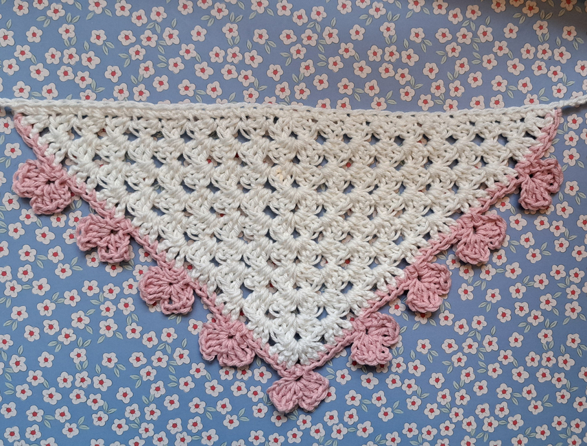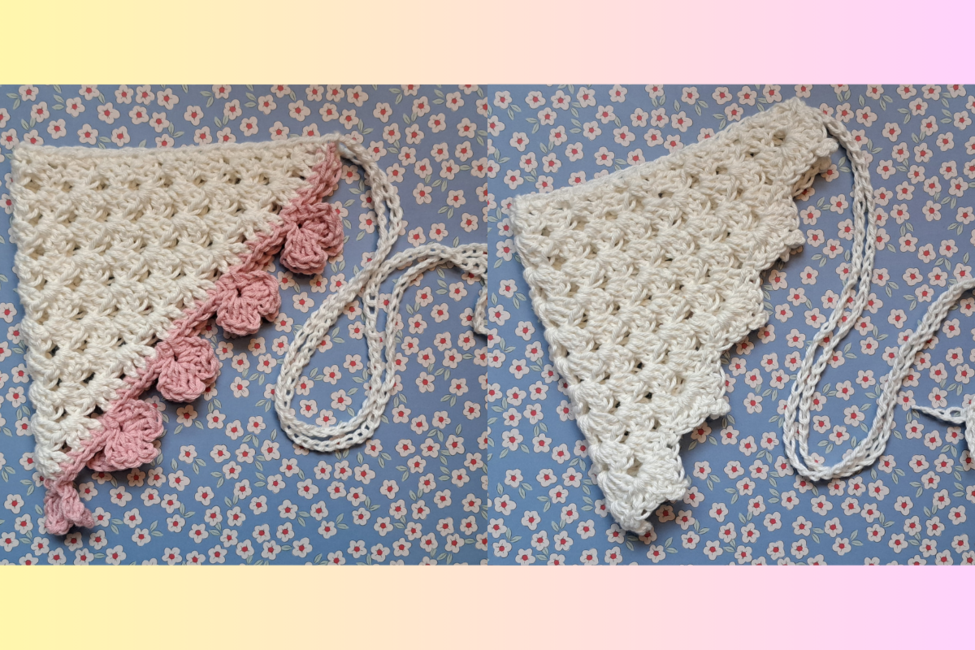 Both the Valentina and Evelina mini hair bandanas are granny stitch bandanas, one with a cute heart trim and the other with a sweet picot trim, perfect for valentines day, picnics in the park or beachy days!
