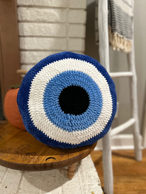The Evil Eye Pillow (Large) pattern makes a Home Decor. It is a Beginner Crochet pattern.