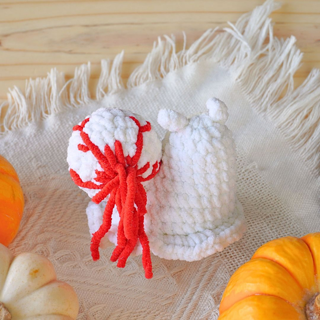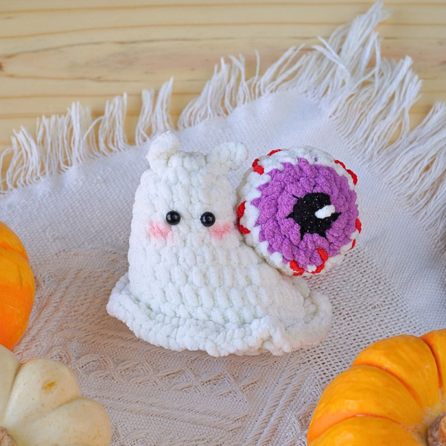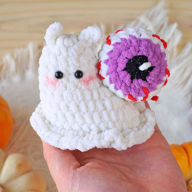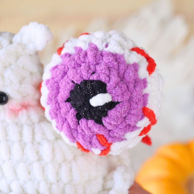 This spooky yet adorable crochet pattern showcases a fluffy white snail with blushing cheeks, carrying a whimsical shell that resembles a giant, colorful eyeball.