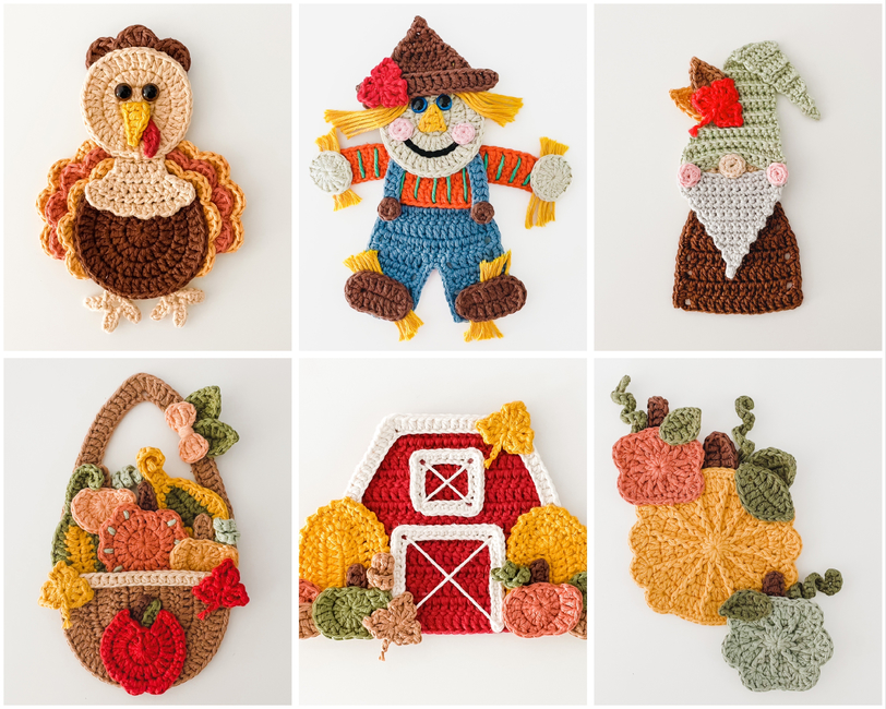This bundle includes 6 patterns: Buttons The Scarecrow Fall Festival Barn Fall Harvest Basket Gnolan The Fall Gnome Pumpkin Gourd Trio Thomas The Turkey