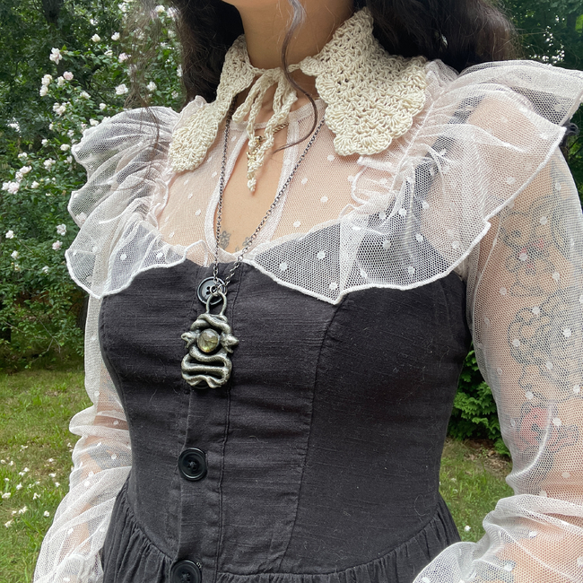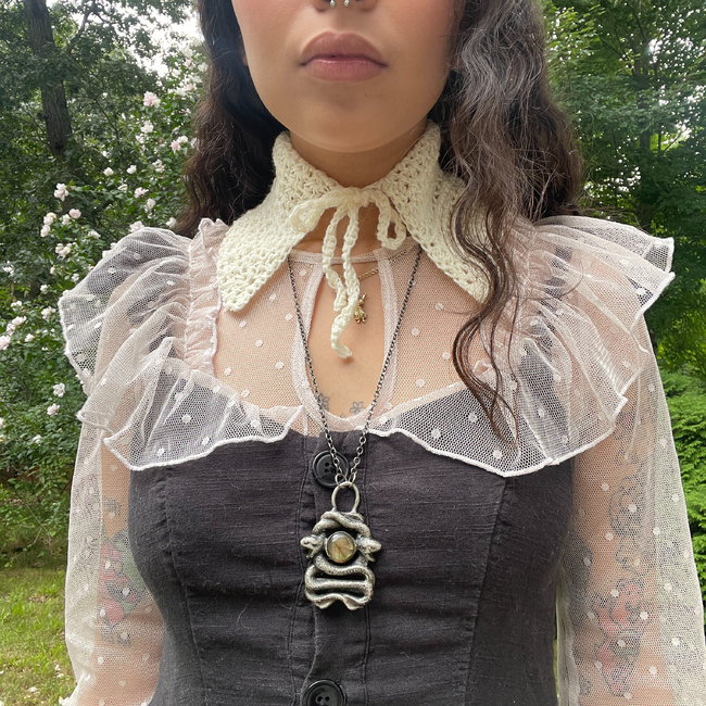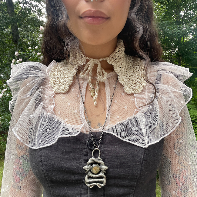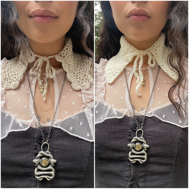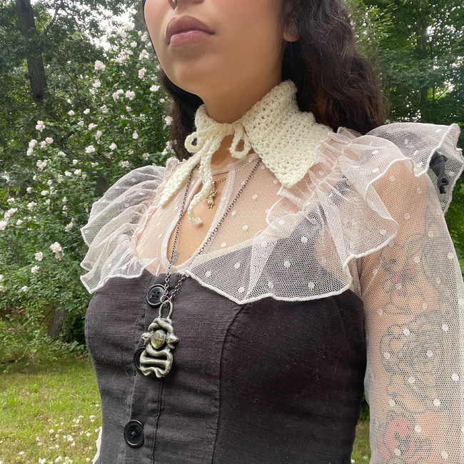 The Finley Collar, coming in two variations, is a detachable crochet collar. I designed this to layer with outfits, and I created two versions to suit different styles. This pattern is suitable for beginners-advanced beginners.