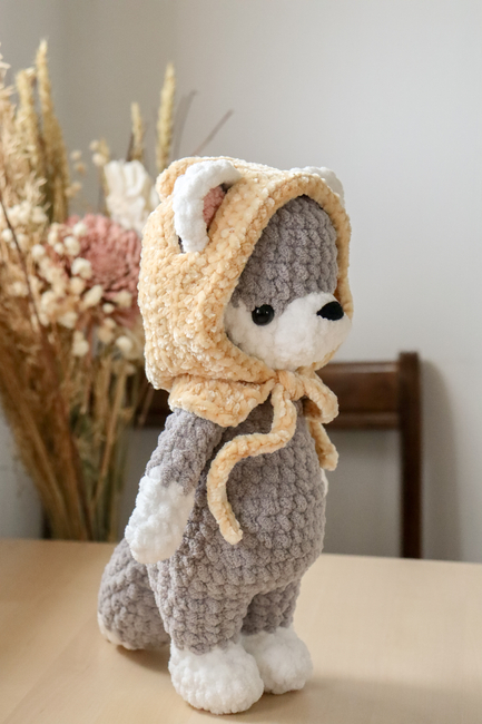 Wolf: I used Bernat Blanket in ”Seagull Grey” Wolf: I used Bernat Blanket in ”Tan Pink” I used Petite Purl by Loops & Threads in ”Tan” (crossbody bag) Fox: Bernat Velvet in ”Indigo Velvet” (cowl) Wolf: Bernat Baby Velvet in ”Soft Sunshine” (cowl)