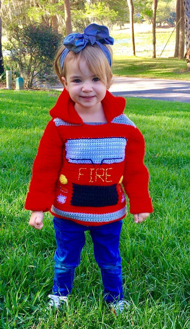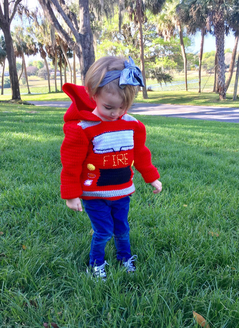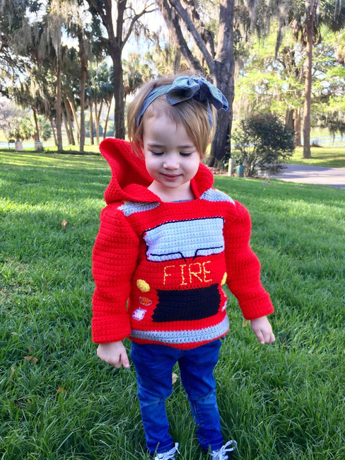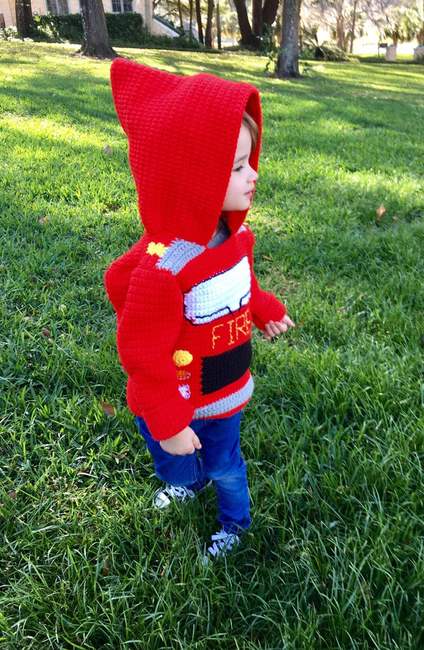 Every child wants to be a firefighter at some point in their life. Make your little one this fire truck hoodie for Halloween. Pattern includes toddler sizes 2, 3 and 4. Sweater zips up the back. Crocheted in worsted weight yarn. Makes a great birthday gift or Halloween costume. Detailed instructions including step-by-step photos and color coded charts for each size. Step-by-step video at https://youtu.be/ftJ91nq2_zQ