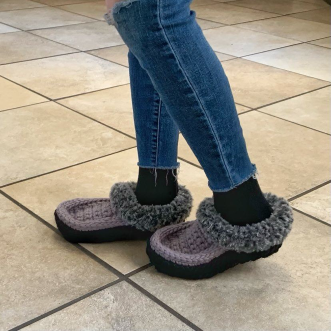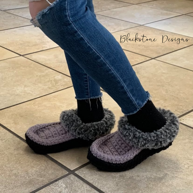These slippers mimic the popular moccasin shoes! They have a low ankle and fur cuffs. They are so comfortable, they make great house shoes!