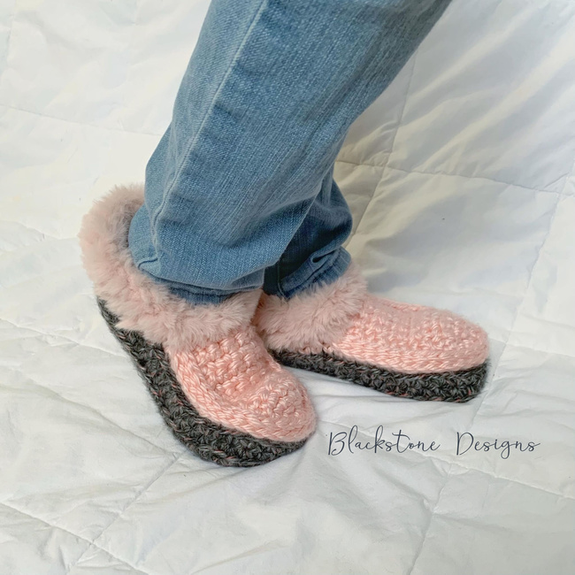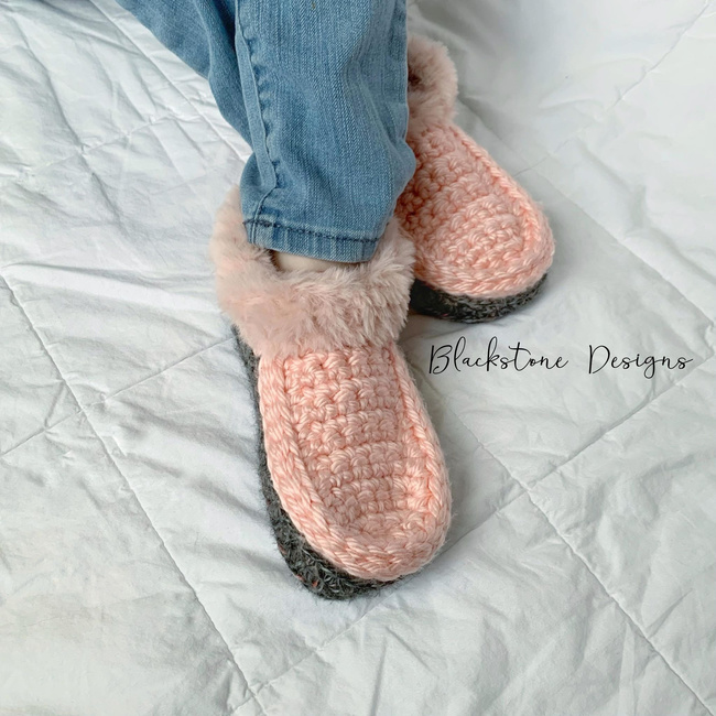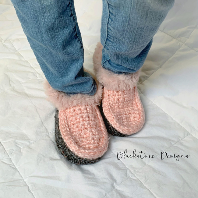 These slippers mimic the popular moccasin shoes! They have a low ankle and fur cuffs. They are so comfortable, they make great house shoes!