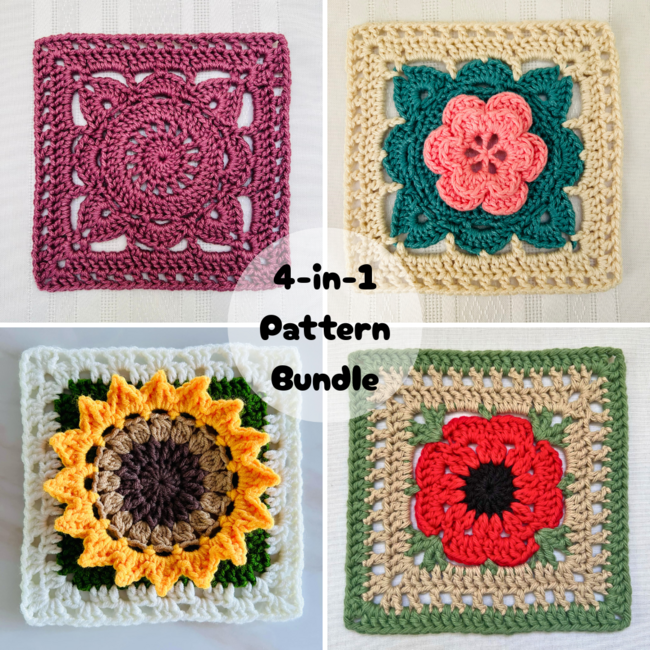 The Flower Granny Square Bundle contains crochet patterns for four beautiful floral granny squares! These squares can be joined together to create blankets, bags, cardigans, cushion covers and much more! These granny squares are fun and easy to make as they don't require any sewing. Each pattern contains easy-to-follow instructions with process photos that guide you through each step! Get four patterns for the price of three with this bundle!