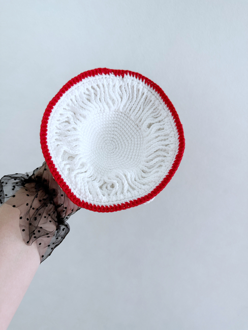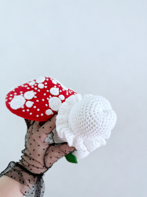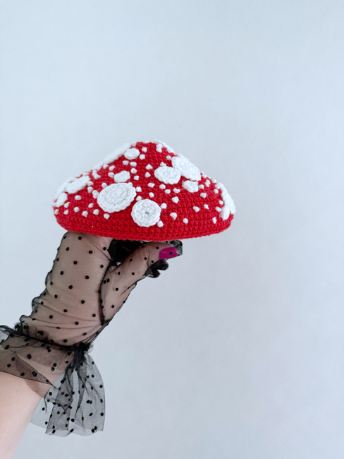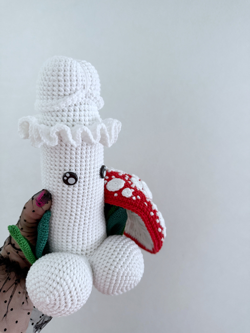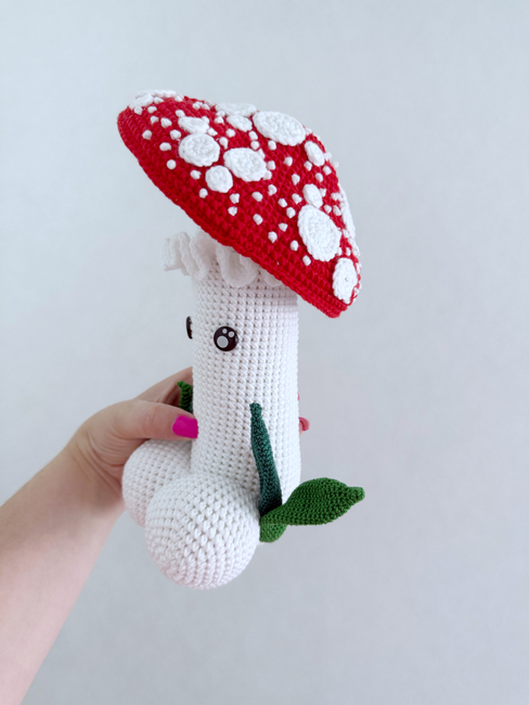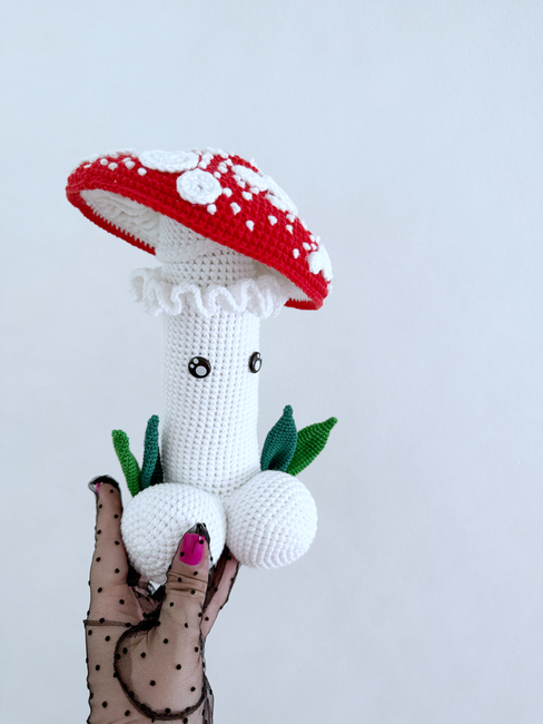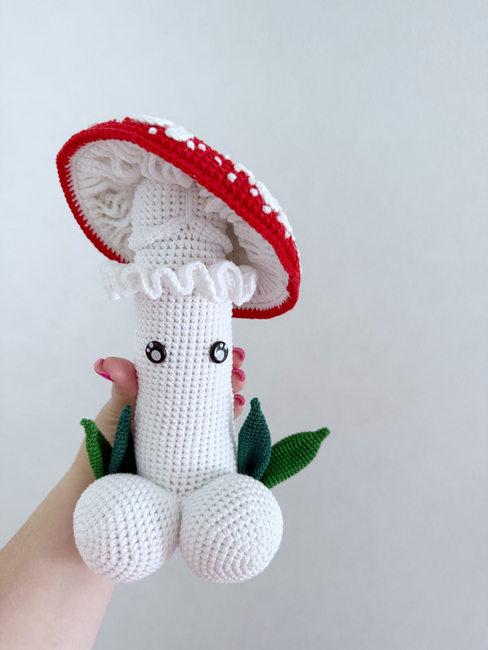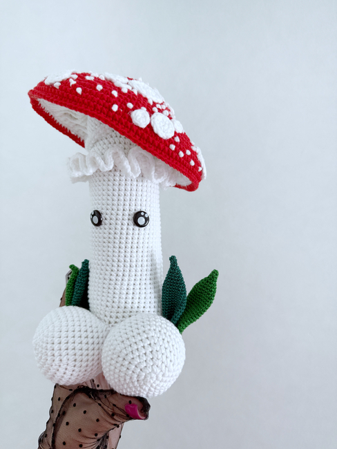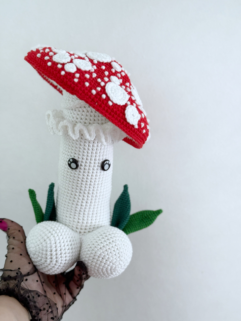 HandcraftByMK designed the Fly Agaric mushrooms crochet penis pattern. Find more of their patterns on their Ribblr shop page.