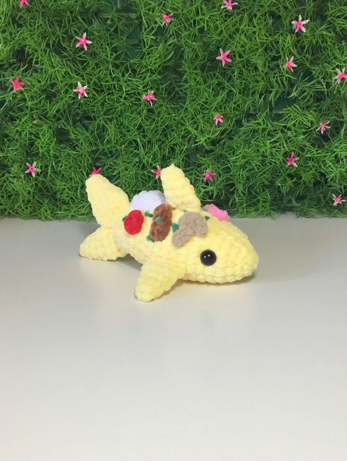 - Yarn: any type of normal plush yarn in cream, white, yellow, light green and dark green (Avocado Toast Shark); purple and green (Eggplant Shark); cream, red, green, yellow and brown (Hamburger Shark); yellow and green (Corn Shark); yellow, red, pink, green, white, brown, cream, and beige (Build-your-pizza Shark);