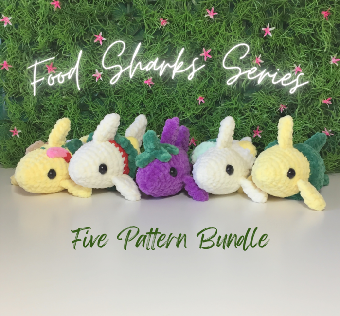 It includes the pattern for the Avocado Toast Shark, Eggplant Shark, Hamburger Shark, Corn Shark and Build-your-pizza Shark!