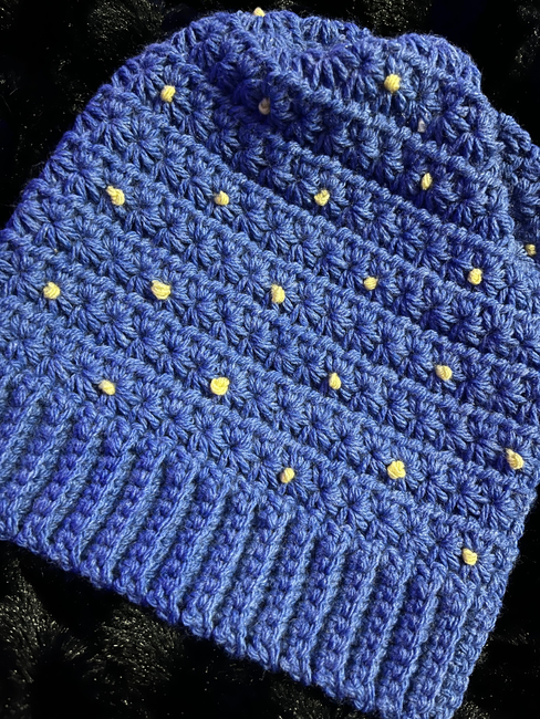 Hooking with Sam designed the Forget-me-not Beanie pattern. Find more of their patterns on their Ribblr shop page.