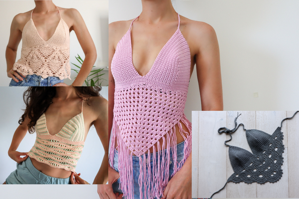 A bundle of 4 beginner friendly crochet tops! Featuring two different cup styles and 4 unique bodice patterns that are worked directly onto the bra top. Learn the granny triangle, pineapple stitch, virus stitch and open wave stitch with these 4 patterns for the price of 3 :)