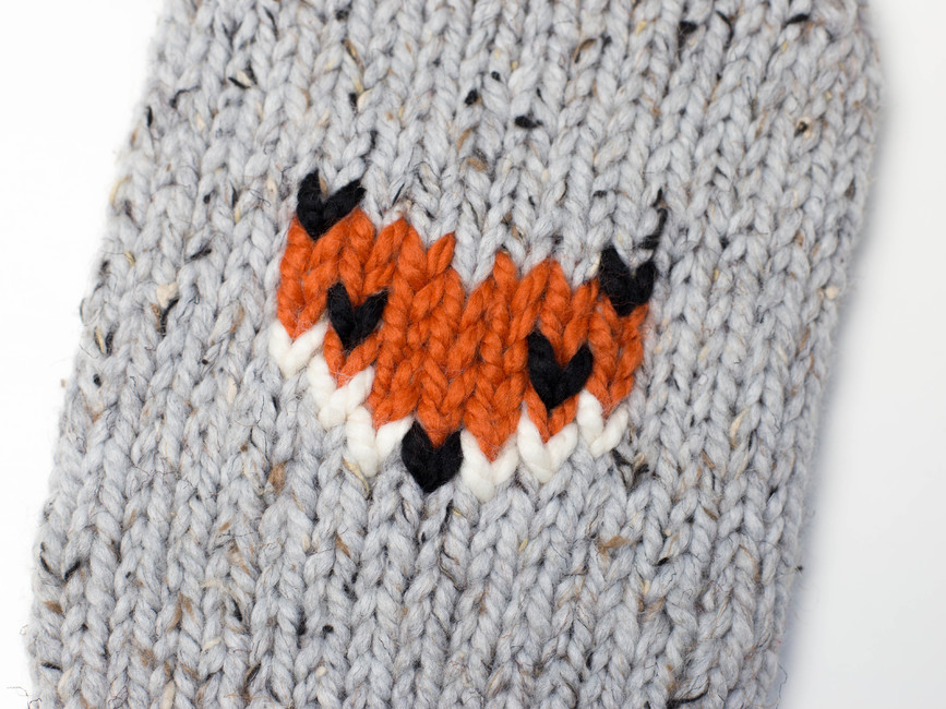 The cover is knit in the round. The fox is added on afterwards using a duplicate stitch.