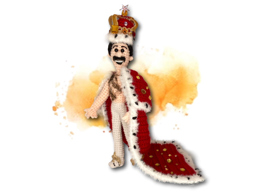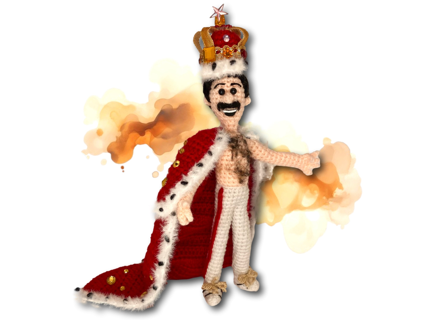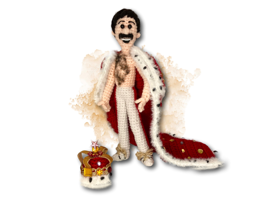 This killer queen is worked in worsted yarns with a bejewelled royal robe and crown, fit for a crochet rockstar! With wired, posable limbs and a mouth open in song, he will, he will...rock you! This pattern features more than 40 colour photos, as well as a video tutorial link, and is suitable for crocheters with some experience. Get ready to crochet with the champions!