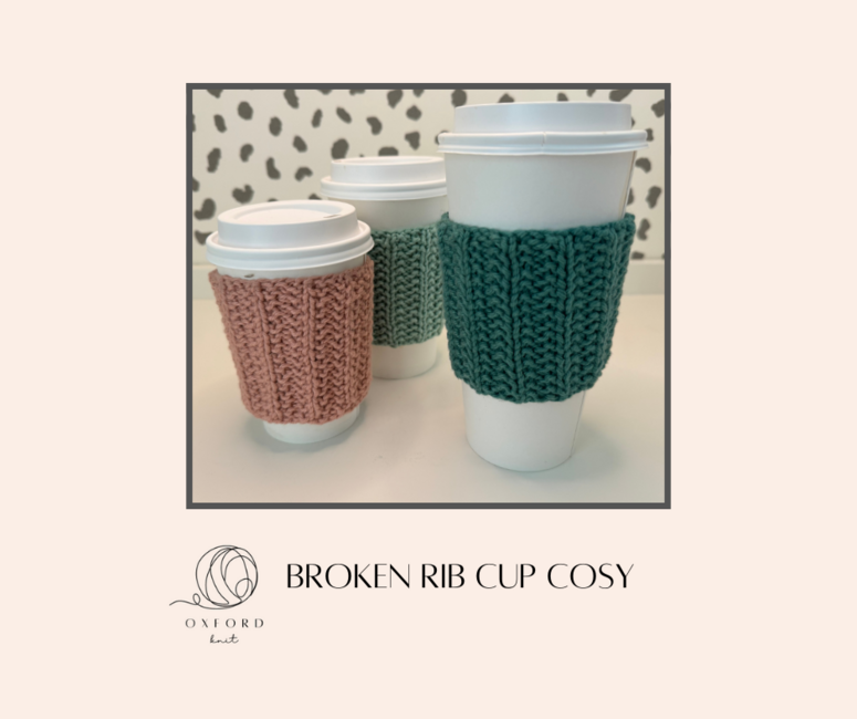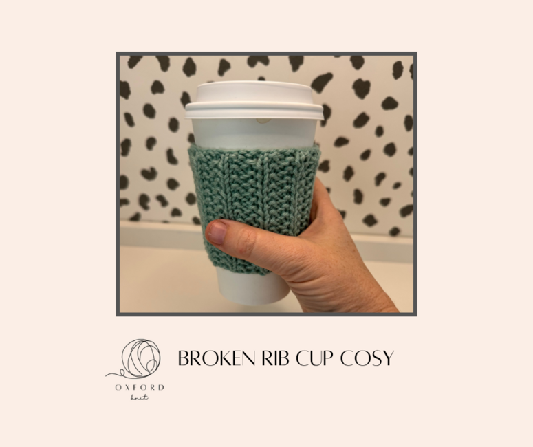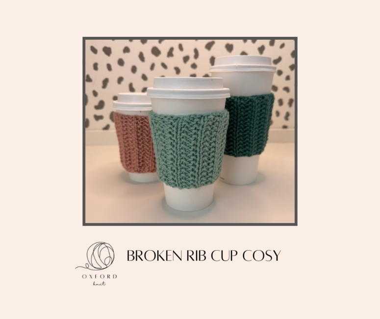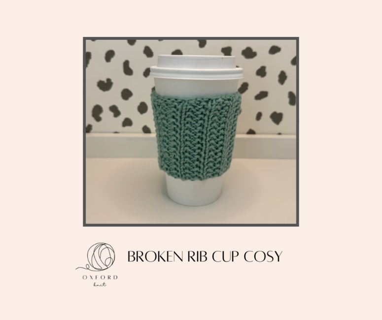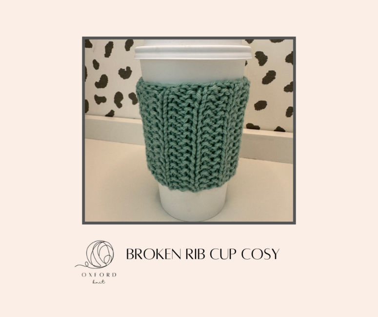 Oxford Knit designed the FREE Broken Rib Cup Cosy pattern. Find more of their patterns on their Ribblr shop page.