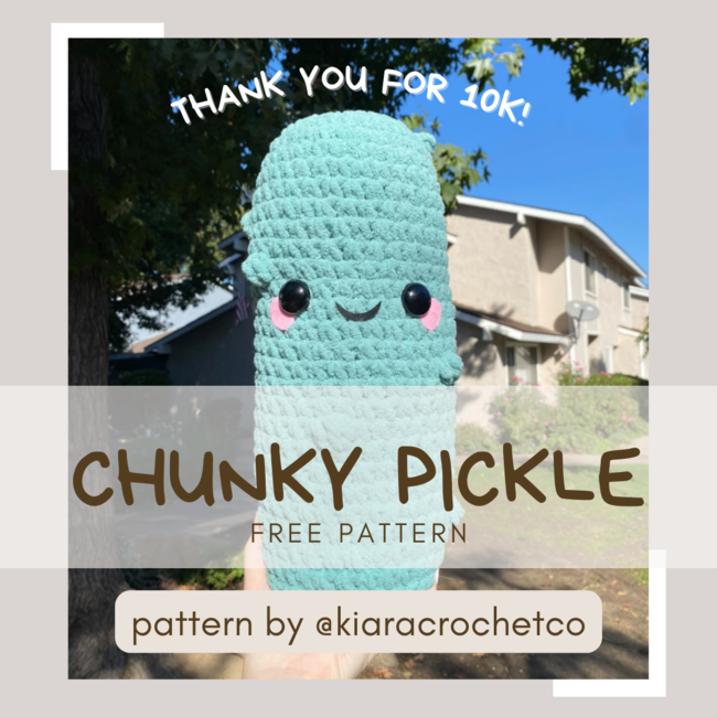 free chunky pickle pattern is a Beginner Crochet pattern designed by kia's cozy crafts for making an Amigurumi. Hi there! Thank you for checking out my free pickle pattern, I hope you love making your plushie! If you plan to use blanket/weight 6 yarn, it will turn out fairly large (one of my testers said over a foot tall)! The size will definitely vary depe...