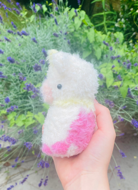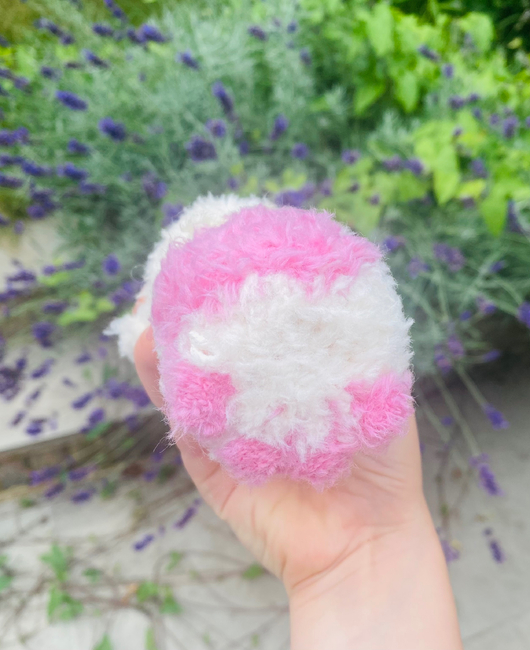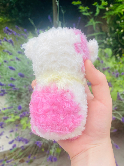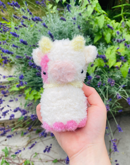 This is my fluffy pink cow, Rose. She is an intermediate level pattern, as she includes sewing and colour changing. I used thin fluffy yarn, but the muzzle is a thicker yarn than the body. I hope you like making Rose as much as I did!