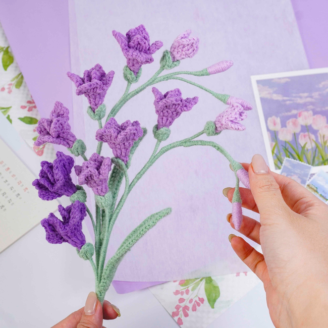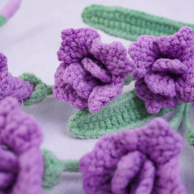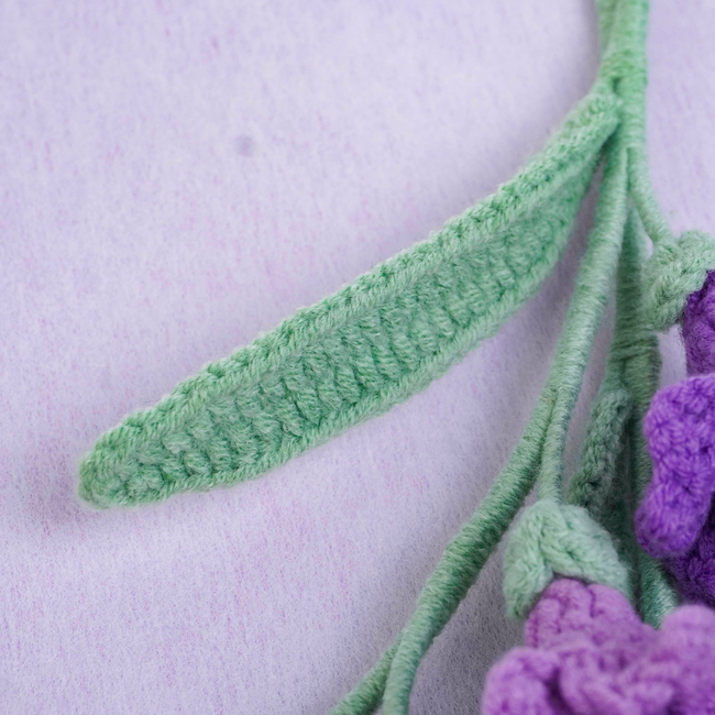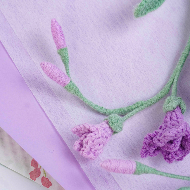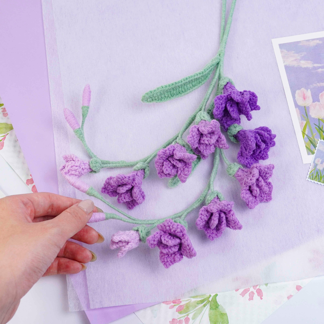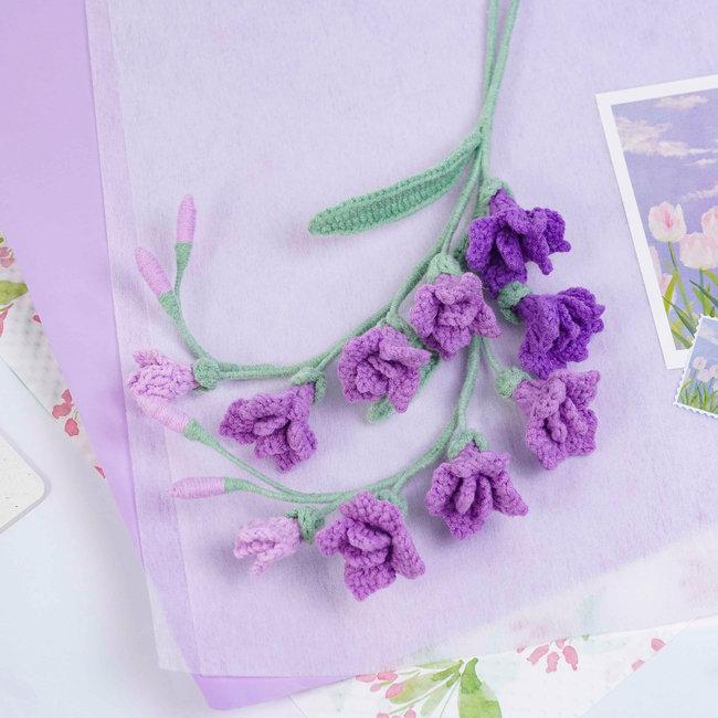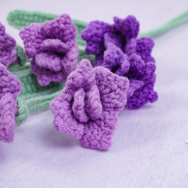 To make Freesia Flowers Crochet Pattern you will need: Color: Dark purple, purple, light purple, and green, Stitch marker Sewing needle Scissors Craft wire (0.5mm)Floral wire (2mm*40cm)Hot glue gun. Tools required: 2.5mm.