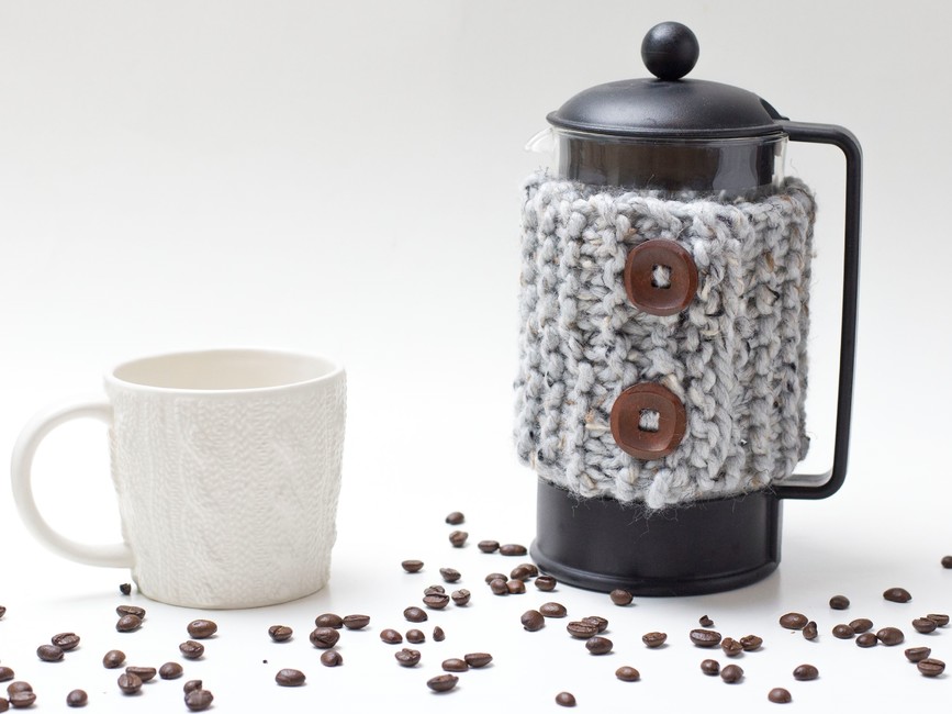 The pattern includes directions for two standard french press sizes - 8 cup / 1 litre and 12 cup / 1.5 litre. This pattern can be adjusted for a variety of sizes.