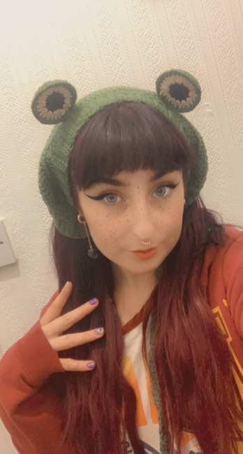 Sunshinegemini designed the Frog Bonnet - crochet pattern. Find more of their patterns on their Ribblr shop page.