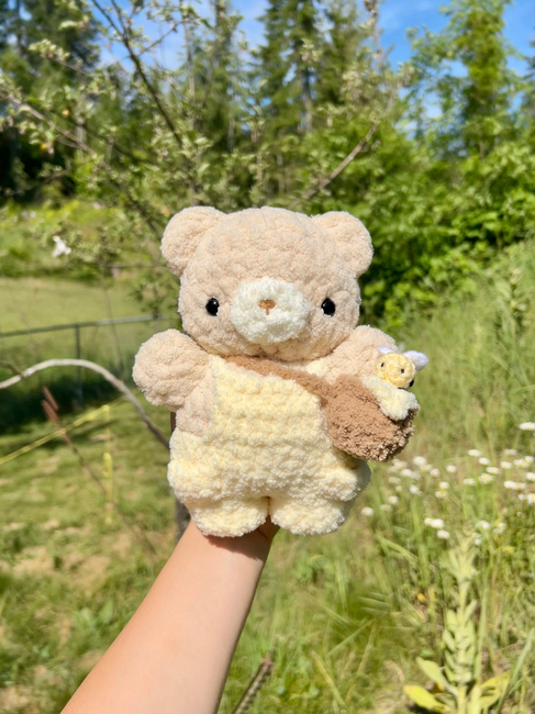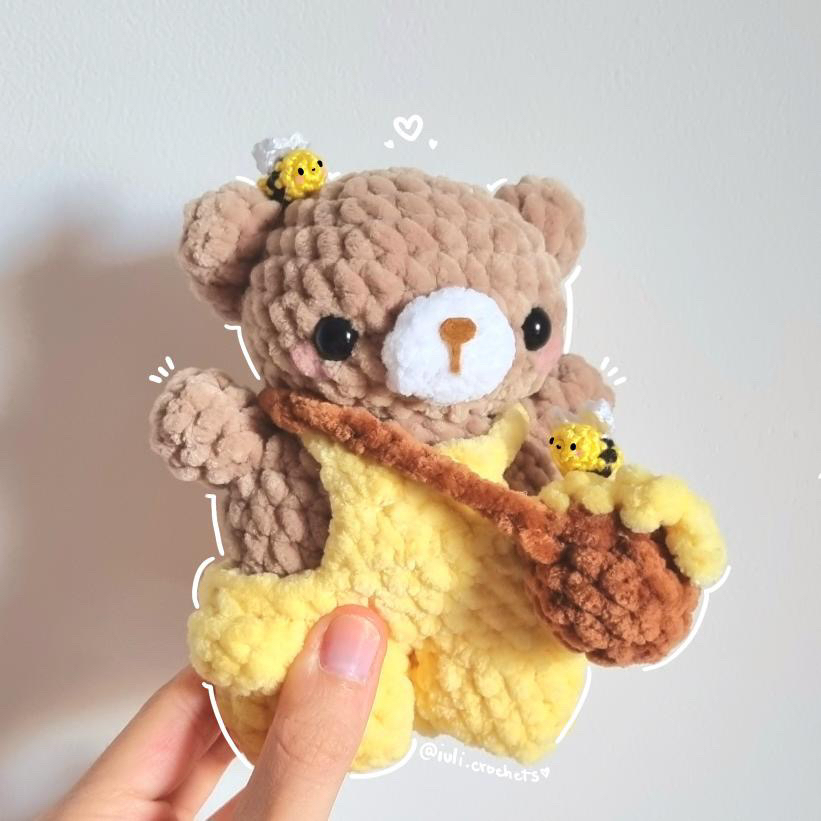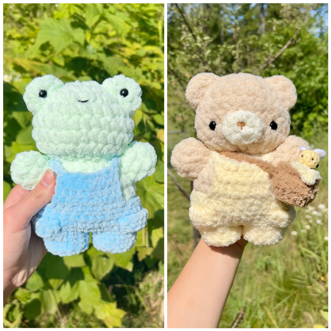 This bundle includes 2 patterns: Frog in overalls, and Honey Bear in overalls! The Honey bear also includes the pattern for the honey pot bag and mini bee!
