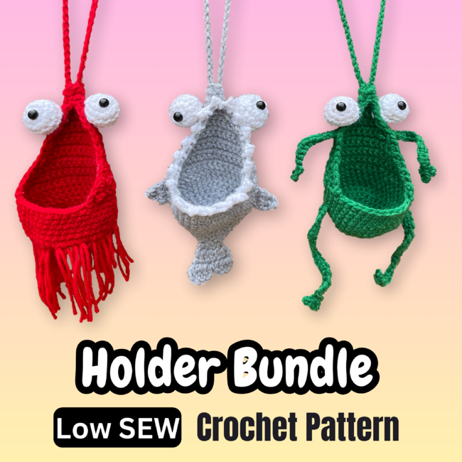 Dive into this crochet pattern bundle featuring the yip yip holder, shark holder, and frog holder, each with a big open mouth perfect for holding plants, small items, or adding quirky decor to your space! These low-sew crochet patterns are beginner-friendly and ideal for market prep, working up quickly to create eye-catching crochet plant holders, car hanging crochet patterns, or unique gifts. Whether you're crafting a hanging yip yip, a shark car hanger, or a frog crochet planter, this bundle is packed with fun and functionality. Explore the world of crochet alien patterns, shark crochet patterns, and frog crochet patterns while making practical and playful creations!