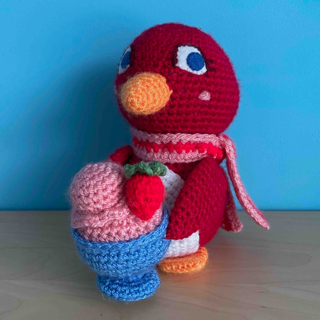 This is an amigurumi pattern based on a Frozen Treat Penguin (Strawberry Red), carrying a dish of strawberry ice cream.