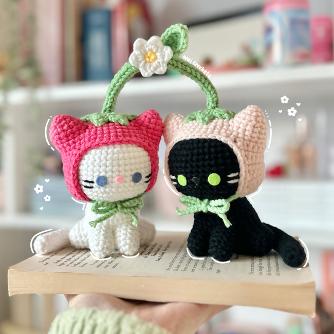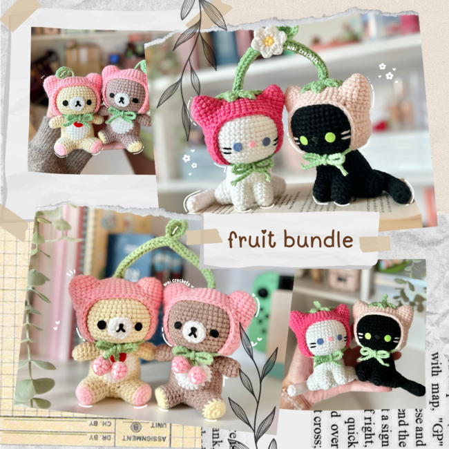 This bundle includes both Cherry Beary and Strawberry Kitty patterns. The patterns are categorised as intermediate level of difficulty, as they involve color changing, sewing, and cutting felt. The hat is removable, so you can switch it out with other hats/colors if you wished! The pattern also comes with instructions to make a single fruit (one bear/cat) and double fruits (two bears/cats). Step by step instructions are included, along with pictures, to guide you through making your own fruit animals!