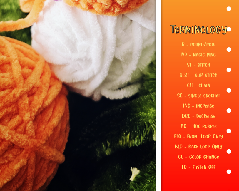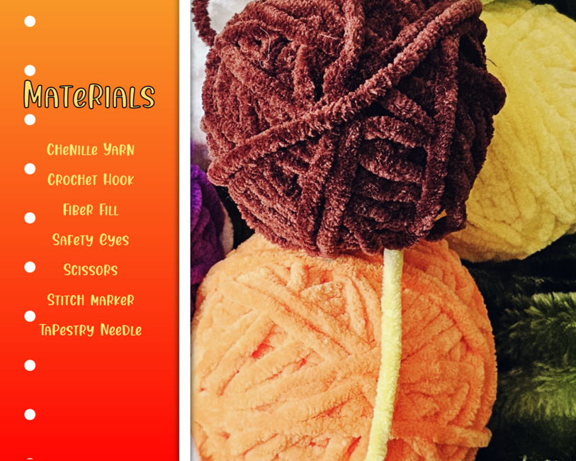 - Chenille Yarn - Crochet Hook - Fiber Fill - Scissors - Stitch marker - Tapestry Needle