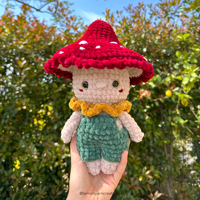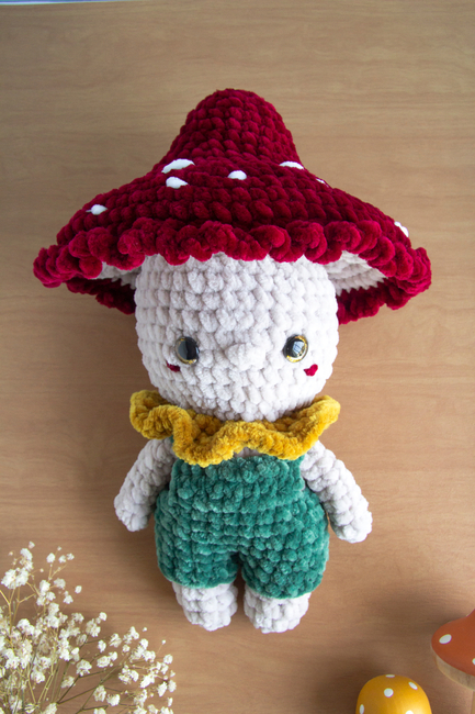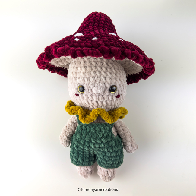 Fungi the Toadstool is a no-sew pattern. The parts are worked individually and joined as you work, thus not requiring any sewing, only some embroidery. The overalls are worked separately and can be removed if desired. Fungi is the perfect companion for this autumn season.