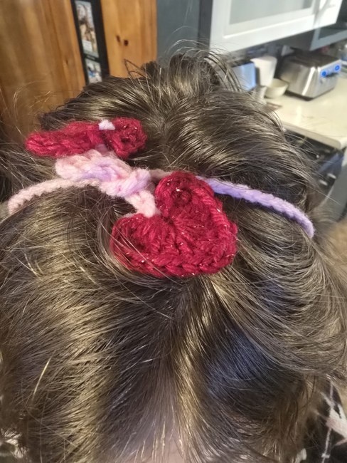 To make Gal-entine@qs Day Hair Bow you will need: Less Than 1 Skein, Less Than 1 Skein, You can sub any yarn with appropriate hook size.. Tools required: I used a 4 mm Hook.