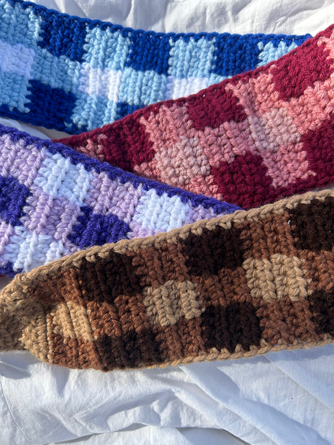 This is a crochet pattern for a gingham headband. Perfect for spring and summer, keeping hair out of the face while still being fashionable. Very easy to work up, and is a perfect scrap yarn project. Some photos are included alongside the instructions.