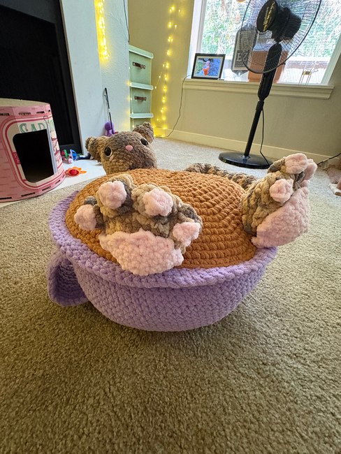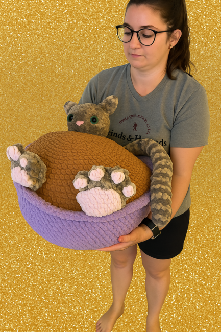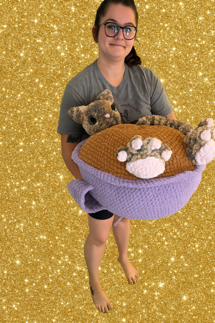 Kira Crochets designed the GIANT Cat Sitting in a Coffee Cup pattern. Find more of their patterns on their Ribblr shop page.