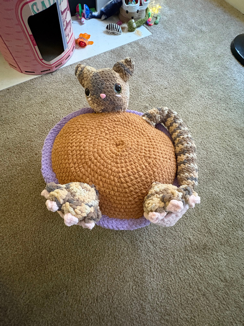 Giant cat sitting in a cup of coffee! This pattern isn't too complicated, it's fairly beginner friendly . It creates a HUGE cute kitty pillow :)
