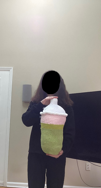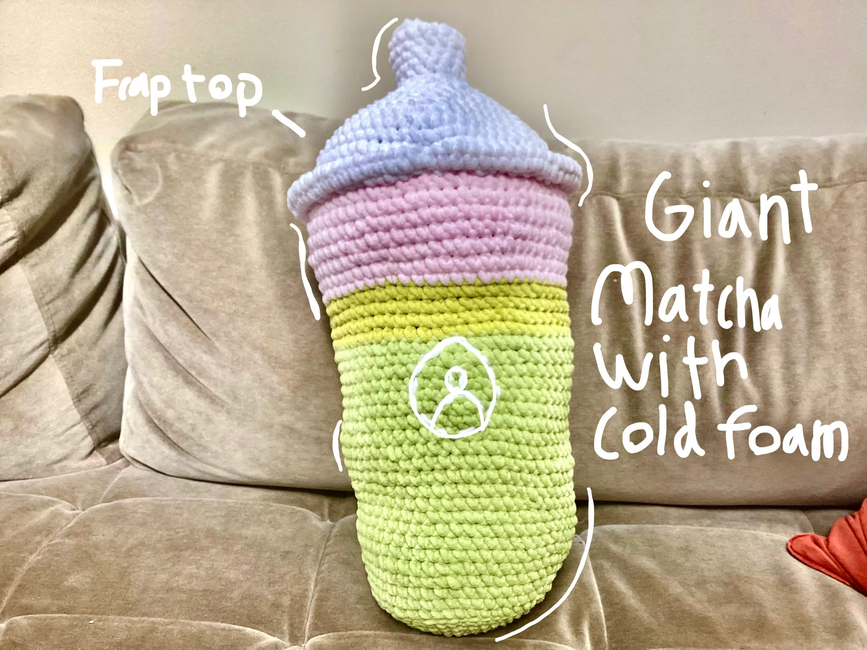 This Starbucks-inspired matcha cup with strawberry cold foam and a frap top is absolutely delicious! Worked from top to bottom, you will need basic amigurumi skills and basic sewing skills. This cup is very low sew, where you only have to sew the rim together. At 64 rounds, this guy is ginormous. The largest round is 84 stitches, and continues in for multiple rounds. Feel free to use a different colored cold foam, or even make this an iced coffee. Please do not distribute this pattern without my consent, and please give credit if you sell this make. Happy crafting!
