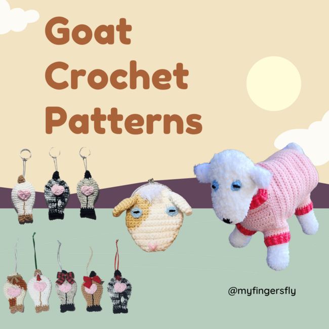 Great bundle for goat lovers! Crochet a baby goat in removable pajamas, a goat coin purse, or some goat butt ornaments that can also be made as keychains.