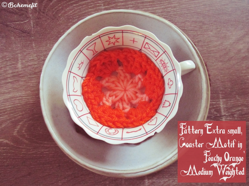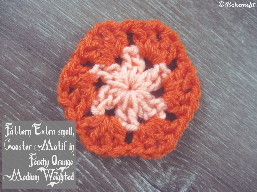 Using a DK light garn held worked as two threads worked together along with the main peach medium weighted garn with a 5mm crochet hook, adds both texture and fiber interest to the motif.
