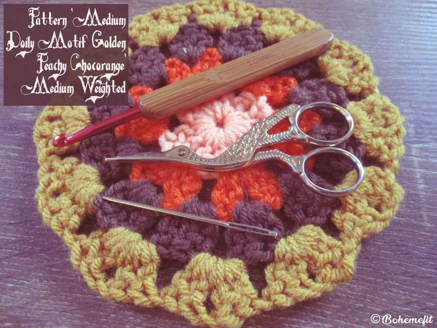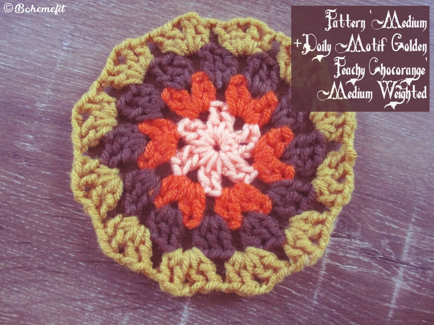 Using a DK light garn held worked as two threads worked together along with the main peach medium weighted garn and medium weighted Chocolate brown, and 5mm crochet hook, adds both texture and fiber interest to the motif.