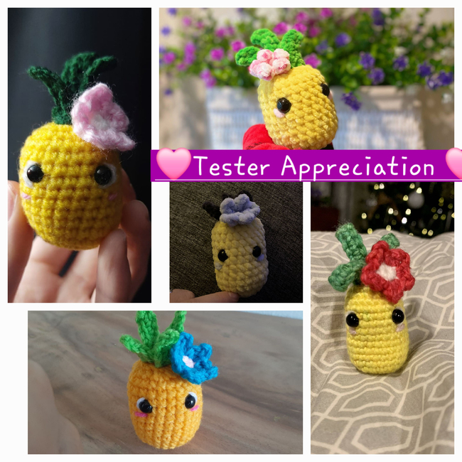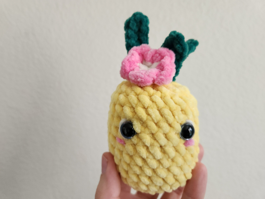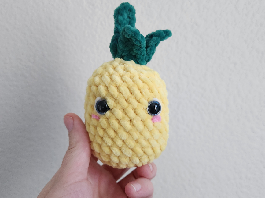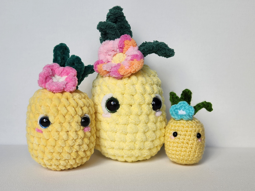 Goldie pineapple was my very first commission and free-handed project. The pattern builds up very easily and is low sewing. It works well in different yarns. I have a photo showing the size difference between weight 4 acrylic, weight 6 bulky and weight 8 super bulky yarn. The written pattern is done in weight 4 acrylic yarn and a 3.25mm crochet hook. The final size was 3.5" tall and 2" wide. Let's get started!